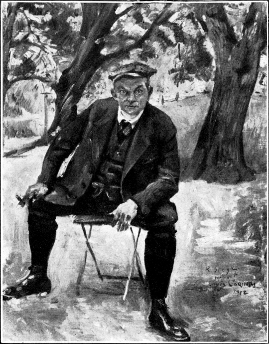 So streng auch sonst die Erziehung des kleinen im Sinne der Mutter spät[S. 26]geborenen Nachkömmlings war, so sehr scheinen doch die Eltern und ganz besonders der Vater an dem Jungen gehangen zu haben. Die älteren Stiefbrüder waren alle Handwerker geworden; er, der Jüngste, der vielleicht dem väterlichen Stolz wie „von höherer Art“ erschien, sollte wie Rembrandt, des Müllers Sohn von Leiden, das gelehrte Studium ergreifen, und so kam der Junge mit dem achten Lebensjahre auf das Gymnasium nach Königsberg. Er wurde bei einer Schustersfrau, der Schwester seiner Mutter, untergebracht und trat nun — reichlich verschüchtert — in diese neue Welt ein. „Alles war dem kleinen Jungen neu: die feinen Jungens in der Klasse, das ewige Hochdeutschsprechen und die fortwährenden Nörgeleien über seine falsche Aussprache, endlich die vielen großen Häuser. In seinem Kopf ging ein ganzes Räderwerk herum, wogegen die Lohmühle zu Hause nichts war.[S. 27] Am besten gefiel es ihm noch beim Ohm am Schustertisch. Hier konnte er, ganz ernst mit dem Ohm und den Gesellen, ebenfalls auf einem Dreibein sitzend, hölzerne Speilen in Reste von Sohlenstücken hineinhämmern.“ So erzählt Corinth selbst von den Eindrücken dieser neuen Umgebung, und er hat in diesem Kapitel seines Buches ein Bild unverwüstlich humorvoller Wirklichkeitsmalerei gegeben, das wie ein Gemälde des alten Jan Steen anmutet. Leider starb der gute Onkel schon wenige Monate nach der Ankunft des jungen Lovis, und nun begann eine schwere Zeit für den Knaben. „Die Schusterstühle und der Tritt und die Glaskugel, die so komisch hell machen konnte, wurden weggeholt —. Das Leben mit der Tante wurde einförmig. Sie knauserte an allen Ecken und Kanten.“ Mit köstlichem Humor schildert Corinth, wie er Einkäufe machen mußte, beim Fleischer z. B. „für anderthalb Dittchen Karbonade“ einholte, die ihm die Ladnerin aus reinem Mitleid verkaufte, da der Vater wohl von der Fabrik sei. Wie er sich vor den Kameraden aus der Klasse schämte, wenn er die selbst gekneteten Brote zum Backen in den Laden des Bäckers bringen mußte, und wie er endlich gegen die Tante zu revoltieren begann, als er Eimer von der Bleiche nach Hause tragen[S. 28] mußte. In diesen Momenten packte ihn bitteres Heimweh, Tränen stürzten ihm aus den Augen, aber er mußte aushalten. — Während bei der Tante der gute Familienklatsch an Sonntagnachmittagen umgeht, sitzt Lovis still dabei und[S. 29] zeichnet. Das besorgt er auch, wenn die Tante glaubt, daß er Schularbeiten mache; es ist sein einziger Trost, „denn längst war ihm die Schule und ebenso die Wohnung der Tante zum Greuel geworden.“ Aber das Leben am Pregel interessiert ihn gewaltig, und die vielen Schiffe und Kähne, die in seiner Einbildung nach fernen Ländern, zu Menschenfressern, Indianern und Malaien hinsteuern, erregen seine Phantasie, und so ist auch Königsberg mit seinem bunten Durcheinander, das wie ein kleines Amsterdam im fernen Osten anmutet, nicht ohne Einfluß auf die künstlerische Entwicklung des Knaben gewesen. Am Schloßberg sah er die Soldaten exerzieren und an der Fischerbrücke hörte er die Händlerinnen ihre Waren laut anpreisen. Die Tante zog eines Tages fort aus ihrer Wohnung am Pregel zu ihrem Schwiegersohn. Der Knabe zog mit. Aber in der Schule wollte es durchaus nicht glücken. Der Ordinarius berichtete dem Vater nach Hause, daß der Junge immer mehr auf Abwege gerate, doch das änderte wenig an der Tatsache, daß dem jungen Menschen „der Bücherranzen immer schwerer und die Schulbänke immer härter wurden“.