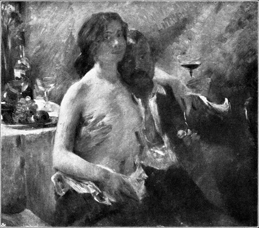 Andere Arbeiten führen unmittelbar zum Atelier der Akademie Julian hin, so der weibliche Akt (Abb. 5 u. 6), während die hier wiedergegebene Komposition unter dem Titel die „Falschspieler“ (Abb. 9) wie das vorher genannte „Komplott“ in stärkerem Maße für die damals bevorzugte Kunstrichtung als solche charakteristisch ist. Das Bild existiert leider nicht mehr. Es ist später in Berlin einmal abgelehnt worden, und da mag es der Meister in einem Moment des Unmuts zerstört haben. Und doch wird man gerade diesen Verlust im Hinblick auf die überhaupt spärlichen Proben aus der Frühzeit doppelt bedauern. Denn Corinth hat hier bereits mit selbstherrlicher Meisterschaft eine höchst dramatische Szene wundervoll darzustellen vermocht, wie auch das ganze Milieu dieser Apachenkneipe als Kulturdokument[S. 47] besonders wertvoll ist. Die Gruppe der in Zwist geratenen Menschen hebt sich scharf von dem von außen in die Kaffeeschenke hereinflutenden Licht ab, und jede Bewegung ist hier mit fast photographischer Treue erfaßt.