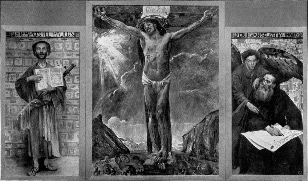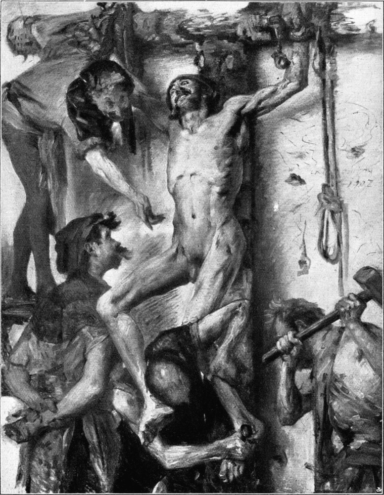 Aus dem folgenden Jahre stammen zwei Bilder, die Corinth wiederum von einer neuen Seite kennen lehren und doch an früher gekennzeichneten Punkten anknüpfen, denen der Meister auch in seiner Selbstbiographie bedeutsam genug Erwähnung getan hat. Man erinnere sich an die Königsberger Zeit, wie er mit dem Onkel Fleischer den Schlachthof zu besuchen und hier nach den Tieren zu zeichnen pflegte. Bei der Schilderung des Pariser Lebens aber verweilt Corinth auch bei dem schönen malerischen Eindruck, den die Schlächterläden der französischen[S. 58] Hauptstadt auf ihn gemacht haben. Solche Reminiszenzen mögen für ihn bei der Entstehung jenes ersten bedeutenden „Fleischerladens“ mitgewirkt haben, den er bei einem Besuch in Unterschäftlarn an der Isar 1897 gemalt hat (Abb. 32). Es ist ein malerisch ungemein feines, koloristisch in seinen weiß-roten Tönen stark vertieftes Bild, auf dem die Wirkung des Lichtes wiederum eine hervorragende Rolle spielt. Etwas skizzenhafter ist das „Stallinnere“ gegeben, bei dem man entfernt an Zügelsche Motive denken könnte, wenn nicht die malerische Handschrift auf einen so viel ursprünglicheren Künstler hinwiese, der hier seinem Stoffgebiet ein neues, ziemlich vereinzelt gebliebenes Thema anzugliedern bemüht ist (Abb. 33). Dagegen begegnen in den beiden anderen Hauptbildern dieses Jahres, den „Hexen“ und der prachtvollen „Kreuzigung“ in der Kirche von Tölz, von früher her bekannte Motive, so neu auch die Themen im einzelnen sind. Das erstgenannte Werk zeigt in drastisch derber Auffassung eine genreartige, aber doch stark realistische Szene Münchener Lebens, wie etwa ein hübsches Modell für die Redoute vorbereitet wird und wie die neugierigen Gevatterinnen aus der Nachbarschaft baß erstaunt sind über die frische, vielleicht ein wenig zu üppige Schönheit der jungen Hexe, die eben ihre Toilette beendet und kommenden Freuden des Abends entgegenlacht[S. 59] (Abb. 36). Das Bild hat in dem Gegensatz von Hell und Dunkel und speziell in der Gruppe der alten Weiber Momente, die entfernt an Velazquez gemahnen könnten, so gesucht auch dieser Vergleich hier anmuten mag. Hat Corinth hier dem Leben eine etwas indiskrete Szene abgelauscht, so erschüttert der tragische Ernst jener ersten großen Kreuzigungsgruppe, die später von andrer Seite der Kirche in Tölz geschenkt worden ist (Abb. 38). Hier ist nichts, was nicht von der höchsten Meisterschaft des Könnens kündet, und so grausam realistisch auch alle Gebärden dieser Schöpfung sein mögen, so überwältigend ist doch die furchtbare Klage der vier Menschen, die den verscheidenden Heiland umstehen, dessen Erscheinung wie jener Christus am Kreuz von Grünewald im Museum zu Kolmar die Züge des Duldens mit dem göttlich hohen Erlösergedanken verwebt. Prachtvoll ist die Gestalt der[S. 60] klagenden Magdalena, wunderbar echt der tiefe fragende Schmerz, der sich im Antlitz des Johannes spiegelt, welcher die in Ohnmacht dahinsinkende Gottesmutter stützt. Vielleicht, daß ohne die Grimassen schneidenden Gesichter der beiden Schächer das künstlerische Moment dieses Bildes noch besser zum Durchbruch käme — vielleicht, daß sich erst im Gegensatz zu diesen brutal realistischen Gesellen die erschütternde Tragik, von der die Gruppe der Klagenden erfüllt ist, voll empfinden läßt. Einerlei, das Werk gehört — so wie es ist — in die vorderste Reihe jener Kreuzigungsgruppen, die uns von den ganz großen Meistern der Kunstgeschichte[S. 61] geschenkt worden sind, und es ist durchaus nicht nebensächlich, im besonderen darauf hinzuweisen, daß sich Corinth in der religiösen Inbrunst seines Gefühles hier dem deutschesten aller Maler, dem Meister des Kolmarer Altares nähert. Aber es muß auch an dieser Stelle gesagt werden, daß diese „Kreuzigung“ schlechthin als das Bild seiner Münchener Zeit angesprochen werden darf, ähnlich wie die früher genannte, in Königsberg gemalte Pietà im Magdeburger Museum das Werk seiner ersten selbständigen Periode ist. Vielleicht, daß man überhaupt — auch in der Folge — dem Künstler Corinth in seiner wahren Größe nie ähnlich nahe kommt wie auf jenen religiösen Schöpfungen, auf denen sich das Wesensstarke — man möchte sagen — Urgermanische seiner Art am unverfälschtesten ausgesprochen hat. Sie kennzeichnen schlechthin die eine große, künstlerisch impulsiv gestaltende[S. 62] Seite seines Wesens, die nie den Ernst und die große Menschlichkeit verleugnen kann, wie die arkadisch heiteren mythologischen Bilder ihrerseits der kräftigen Lebensfreude ein Denkmal setzen. Zwischen diesen beiden Polen, die den Weltweisen und Lebenskünstler in sich begreifen, scheint das ganze Schaffen des Meisters eingeschlossen.