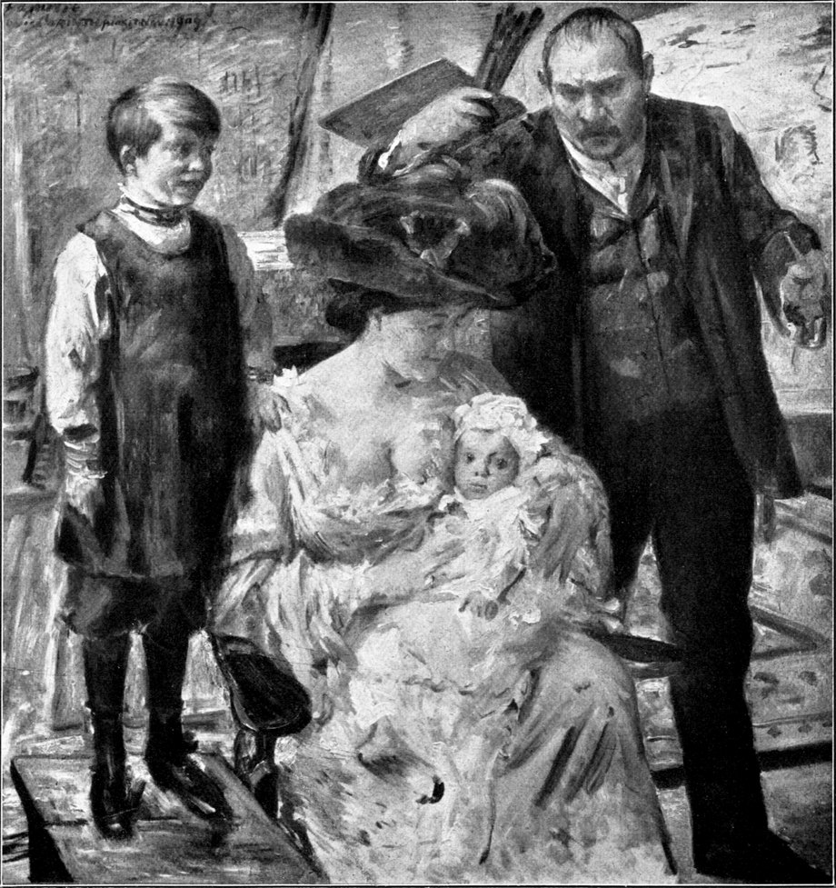 Denn wenn einer von unseren modernen deutschen Künstlern eine geborene Kämpfernatur ist, dann ist es Corinth. Indem er sich mit seinem Schaffen von Anbeginn auf die Seite jener kleinen mutigen Schar stellte, deren Ehrgeiz niemals nach offizieller Anerkennung gedurstet hat, wurde er eine der Hauptstützen der Berliner Sezession, die ihn auch heute noch als eigentlichen Führer anerkennt. Freilich hat Corinth auch für die Folge seine alten, langjährigen Beziehungen zu München nicht verleugnet. Die dortige Sezession hat ihm stets eine ehrende Aufnahme bereitet, und er ist gern und oft auch zu längerem und kürzerem Besuch nach München zurückgekehrt. Bei einer solchen Gelegenheit sind z. B. das Bild der Familie des Dichters Max Halbe (Abb. 44) und ein Porträt der anmutigen Gattin Halbes entstanden. Vor allem aber war es der Aufenthalt an den bayrischen Seen, der Corinth immer wieder nach dem Süden geführt hat.