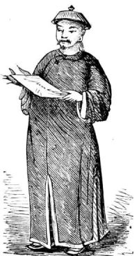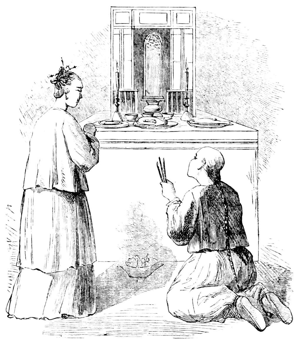 [8] We find one phase of this in the worship of ancestral tablets. These are of wood, a foot high, and bear the name of the departed ancestor, the hour of his birth, and that of his decease. They are worshipped twice a month with tapers and burning incense. Death is believed to liberate three spirits from the tenement of clay; while one of these occupies the grave, and another seeks the invisible world, the third is supposed to take up its habitation in the tablet erected by filial reverence. The accompanying engraving shows one of these ancestral tablets with its inscription in Chinese. (Read Du Bose’s “The Dragon, Image, and Demon.”)