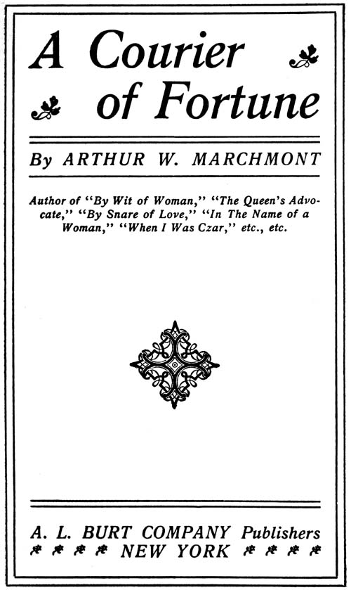 My dear Mr. Stuart: I dedicate this book to you as a memento of our delightful hours of travel and work together in writing the play—“A Courier of Fortune”—founded upon this story. The circumstances of our joint literary work were as unusual to me as they were fascinating; for, although the play was commenced in London, the last “curtain” was not written until my wife and I had crossed the Atlantic and journeyed with you on a tour of over ten thousand miles of railway travelling, through so many of the marvels of this wonderful Continent. St. Louis; Denver; Salt Lake City; San Francisco; the Pacific Seaboard north to Puget Sound; the fertile Palouse Country; Washington, Idaho, and Montana—those wealthy States of boundless promise and marvellous scenic contrasts; the cities of the Lakes, Duluth and Superior; then the young giant twins, St. Paul and Minneapolis; and by way of Milwaukee and Chicago to New York. A tour of momentous interest and a collaboration of close-knit sympathy, cementing a friendship which, I assure you, is one of the pleasantest things of my life.