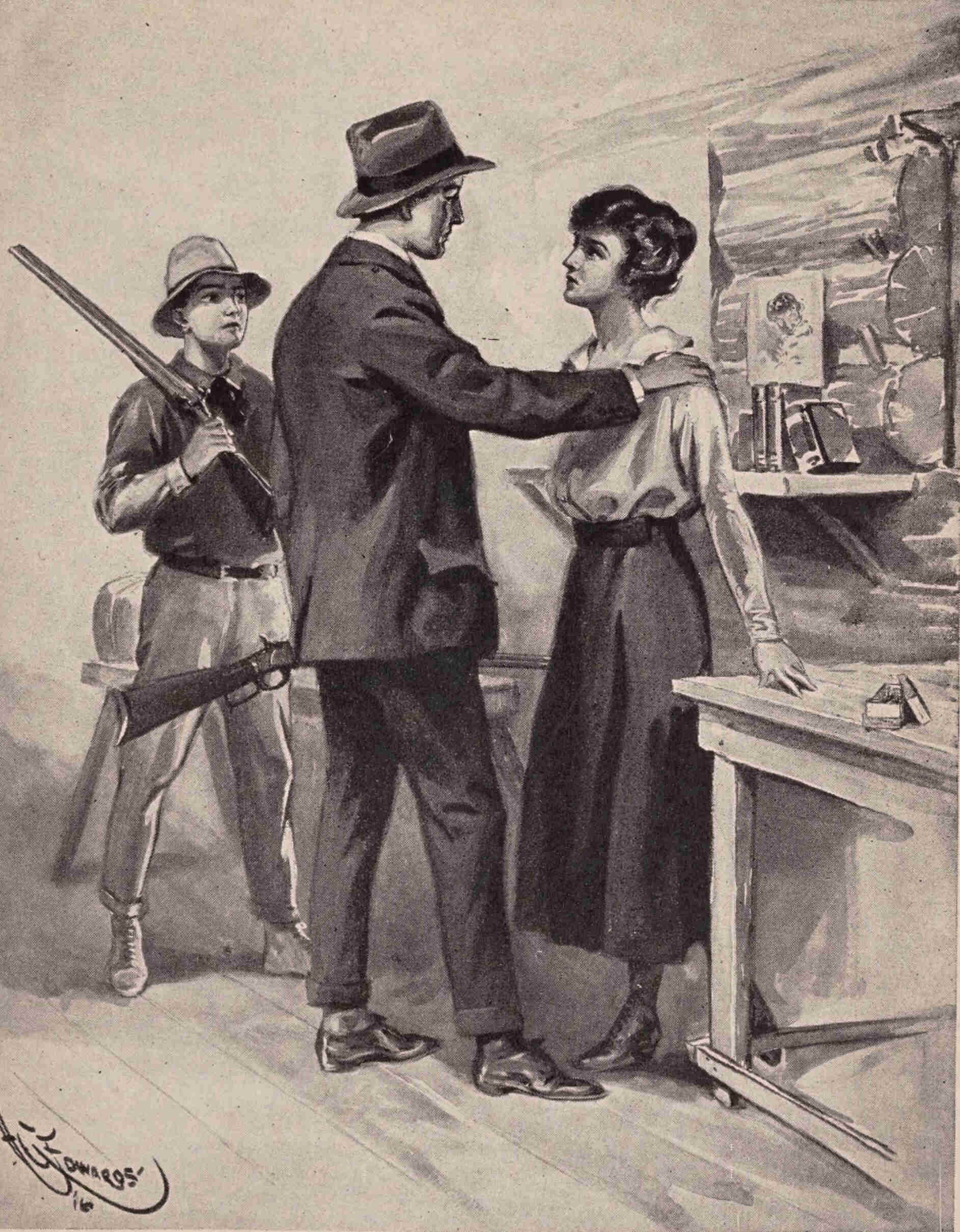 “He fin’ her!” cried Larue, indicating Carl. “I have been crazy. Can’t guess where she go. I search everywhere—up, down the river, in ze woods, in ze smoke—can’t fin’ notting. T’ink she dead, sure. But Mr. Harman fin’ her, and cross ze marais on ze snow-shoes, by gar! Greatest t’ing I ever see!”