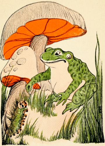 Did I say Bully was singing? If I did, it was all a mistake. Bully wasn't even thinking of singing. He was sitting on his lily pad thinking how uncomfortable he felt. If we had been near enough, no doubt we should have heard him sigh every once in a while. I'm pretty sure he groaned a bit, too, although it might have been something he was muttering to himself. But there was no need to worry, for Bully was not ill. He felt a great deal as you feel after dinner on Thanksgiving Day. You know that then you would like to put on your older sister's or brother's clothes, as your own seem too tight for you. The trouble is, you have been greedy. A young frog is one of the greediest creatures in the world. He will eat bees and flies and ants, grasshoppers, wiggly worms, crawly bugs, and any kind of flying thing—about every little live thing that's small enough to go down his throat.