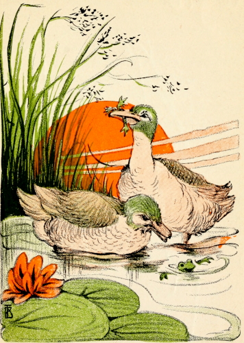 The little ducks under her wings began to quack softly. This meant they were hungry and wanted some breakfast. Her babies must be fed, and she knew of no food quite so good for them as polly-wogs. Why hadn't she fed them before? They ought to have had their breakfast long ago. As she thought this she got up and waddled slowly to the edge of the water, the little ducks following her eagerly. She watched carefully to see that no danger was near. She gathered them all around her for a few minutes and quacked softly to them. Then she led them down into the water. Soon they were having such a splendid time swimming happily about and eating their breakfast.