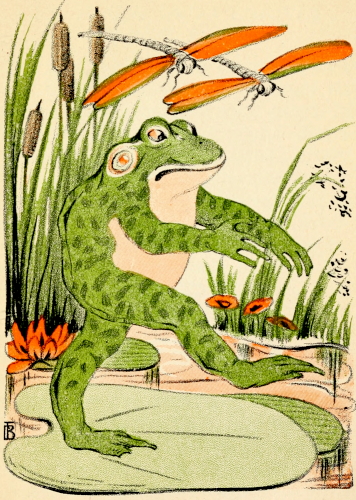 Bully jumped into the water to take his morning swim with all his brothers and sisters, aunts, uncles, and cousins. He wasn't at all afraid the water would spoil that new suit. No, indeed, he knew water wouldn't hurt it in the least. Water on Bully's coat is like fresh paint on an old building. It makes it look bright and clean. How he did enjoy swimming that morning! It was such a comfy suit. He could stretch his arms and legs as far as he wished without a thought of distress or a fear of tearing his new suit. There was such a comfortable feeling in his stomach, as though now he could eat all he wanted. In his new suit he thought himself the happiest and the handsomest boy frog in the pond that morning.