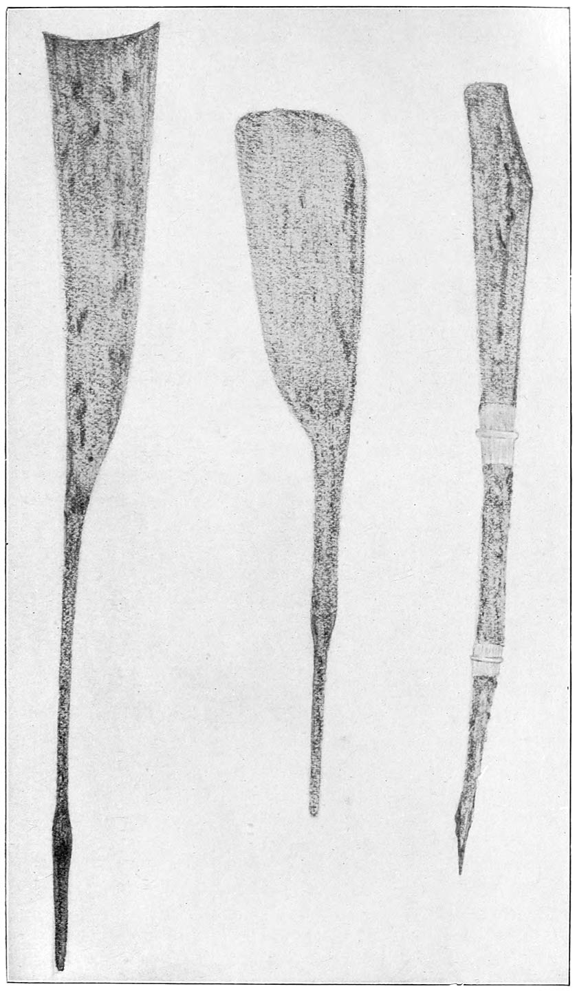 With the Kol-Mon-Annam family the shouldered hoe (see Gurdon, The Khasis, p. 12) has been intimately associated. The Yachungr Naga hoe (thoù), obtained from a tribe hitherto almost entirely isolated from regular intercourse with its neighbours, is almost identical with the miniature Khasi hoe used for hoeing sweet potatoes, and is very similar to the Mikir hoe of the same type, while Mr. Peal found shouldered hoes of a squarer type among some of the Konyak Nagas. Both these types closely resemble some Battak hoes from Sumatra in the Leipzig Museum of Ethnology (Ratzel, op. cit. I. p. 429) and are much the same shape as the Easter Island obsidian tanged blades.24