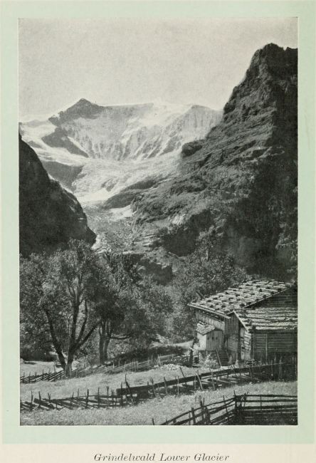 The house stands just above the highroad. Behind it the green Alpine meadows roll steeply upward to the Faulhorn ridge, which separates Grindelwald valley from the depression occupied by Lake Brienz. There are between four and five thousand upward feet in this direction, we being at about the four-thousand-foot level ourselves. Below the road, the land runs down rapidly to the rushing Lütschine, the stream which drains the glaciers. We can hear the roar of the water plainly, especially at night. From the other side of the stream rise almost precipitously the rocky cliffs of the Mettenberg, getting up about ten thousand feet. To the left the gleaming snow and ice of the Upper Glacier, then the square gray, snow-capped mass of the Wetterhorn. To the right the Lower Glacier, with broad white firns and snow peaks, and to the right of the glacier the knife-edged Eiger. These three giants fill up our whole immediate foreground. Far to the right is the[8] saddle-like depression known as the Kleine Scheidegg, where the mountain railroad runs over into the Lauterbrunnen Valley, and to the left of the Wetterhorn, the narrow end of the Grindelwald Valley is closed by a similar saddle,—the Grosse Scheidegg, which separates it from the Rosenlaui Valley. To the extreme right is the rift in the mountains through which the Lütschine escapes and the railroad gets down to Interlaken. But it was all veiled in mist the first day. We couldn’t see fifty feet in any direction. There were some few tantalizing glimpses as the clouds began to break apart about sunset. But the family had to take on faith the “glorious views” I had described till next morning.