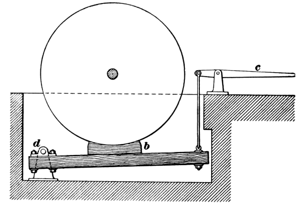 Fig. 12 shows a cage for use in a slope or steeply inclined shaft. It is made of steel with timber platform and differs from a vertical shaft cage mainly in having its upper frame inclined and in running on four [Pg 15] wheels a, b. These wheels usually run on timber guides, so that the safety dogs c will take hold of the guide in case the rope breaks. For slopes of variable inclination, the platform d may be made adjustable by means of a hand lever so as to be always level.