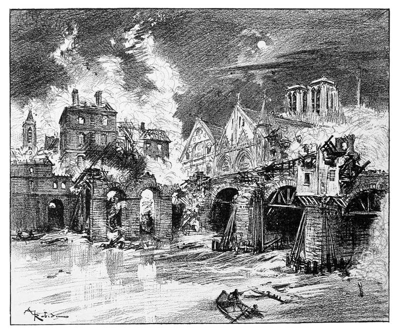 Parmi les incendies dont la cité eut à souffrir il y en eut un, en 586, au temps de Chilpéric, qui faillit la détruire complètement et fut certainement cause de la disparition de bien des édifices de la Lutèce gallo-romaine. Il commença un soir dans la maison d’un marchand sise à l’entrée méridionale de la Cité, c’est-à-dire près du Petit Pont. Une chandelle, oubliée dans un cellier à côté d’une barrique d’huile, mit le feu à cette barrique; le cellier fut bientôt en flammes et l’incendie se communiqua de proche en proche, aux maisons de bois et aux boutiques, à travers toute l’île, d’un bras de la Seine à l’autre, en suivant la grande voie entre les deux ponts, parmi le quartier des négociants.
