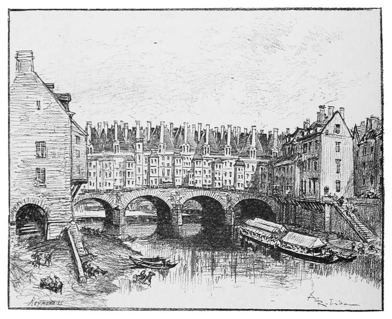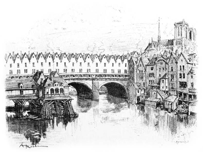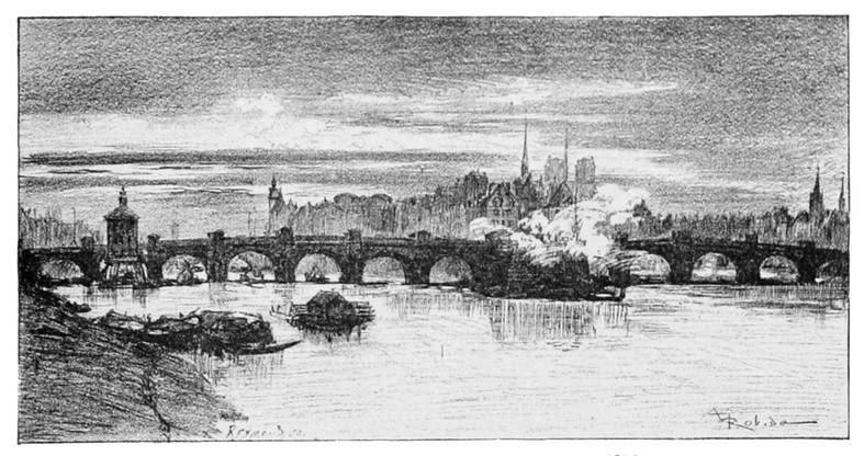 Combien de fois ces deux antiques passages ont-ils été renouvelés, après des aventures diverses, brûlés par accidents fortuits ou faits de guerre, emportés par les inondations ou la débâcle des glaces à la fin des hivers rigoureux; reconstruits en pierres, chargés de maisons serrées en deux files encorbellées sur la rivière, incendiés encore, écroulés, endommagés par les ans,—toujours reconstruits et transbordant d’une rive à l’autre tant de générations, depuis les Gaulois de jadis jusqu’aux Parisiens d’aujourd’hui;—voyant passer sous leurs arches tant d’embarcations diverses, depuis les bateaux gaulois, les nefs romaines, les barques de guerre des Normands, jusqu’aux péniches marchandes et aux bateaux omnibus de nos jours,—et défiler sur leurs pavés tant de cortèges et de si différents, troupes joyeuses, cavalcades de princes et princesses, bataillons en marche pour des parades pacifiques, ou bandes armées se ruant aux massacres des jours de révolution.