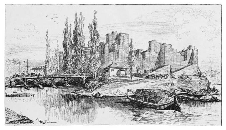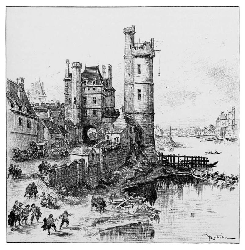 L’un de ces camps, l’établissement le plus important, le lower ou lowar, mot signifiant camp fortifié, était situé sur la rive droite en face des prairies où fut plus tard Saint-Germain des Prés. C’était une grande enceinte carrée couverte par un large fossé dérivé de la Seine, et défendue au sommet du vallum par de fortes palissades. Des logements, des bâtiments divers s’élevaient çà et là dans l’intérieur de l’enceinte. Au centre, sur une motte, s’élevait une grosse tour de pierres et de bois, un donjon de vastes proportions où pouvaient se retirer les {7} défenseurs si le camp était forcé. C’est ce lower, dont Philippe-Auguste put trouver encore les ruines et les fossés, qui devint plus tard le château du Louvre, et la grosse tour au milieu de la cour carrée put remplacer le donjon primitif des Francs.