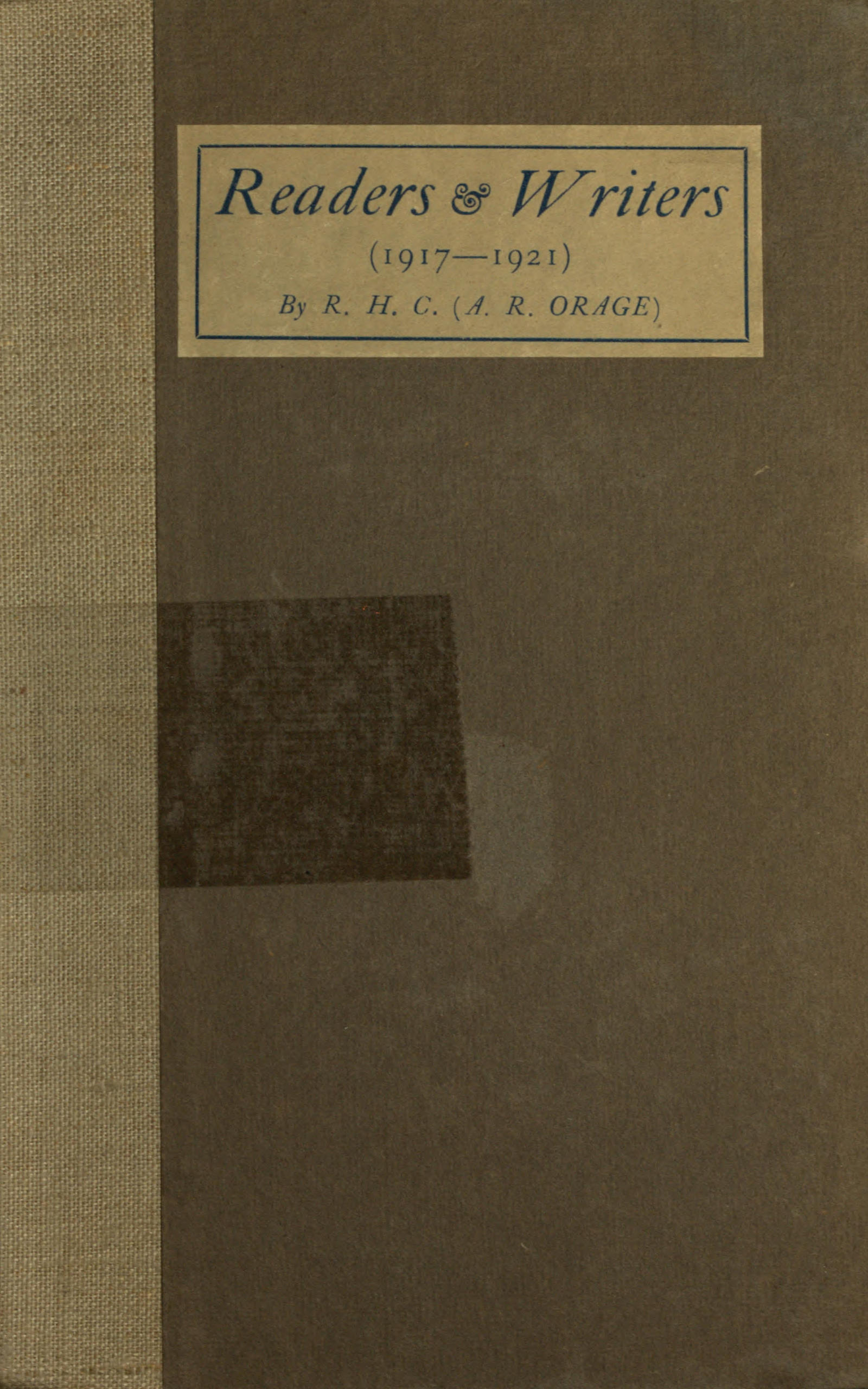 Under the title of “Readers and Writers” and over the initials “R. H. C.” I contributed to the New Age, during a period of seven or eight years, a weekly literary causerie of which the present volume, covering the years 1917-1921, is a partial reprint. My original design was to treat literary events from week to week with the continuity, consistency and policy ordinarily applied to comments on current political events; that is to say, with equal seriousness and from a similarly more or less fixed point of view as regards both means and end. This design involved of necessity a freedom of expression rather out of fashion, though it was the convention of the greatest period of English literature, namely, the Eighteenth Century; and its pursuit in consequence brought the comments into somewhat lively disrepute. That, however, proved not to be the greatest difficulty. Indeed, within the last few years an almost general demand[6] for more serious, more outspoken and even more “savage” criticism has been heard, and is perhaps on the way to being satisfied, though literary susceptibilities are still far from being as well-mannered as political susceptibilities. The greatest difficulty is encountered in the fact that literary events, unlike political events, occur with little apparent order, and are subject to no easily discoverable or demonstrable direction. In a single week every literary form and tendency may find itself illustrated, with the consequence that any attempt to set the week’s doings in a relation of significant development is bound to fall under the suspicion of impressionism or arbitrariness. I have no other defence against these charges than Plato’s appeal to good judges, of whom the best because the last is Time. Time will pronounce as only those living critics can whose present judgments are an anticipation of Time’s. Time will show what has been right and what wrong. Already, moreover, a certain amount of winnowing and sifting has taken place. Some literary values of this moment are not what they were yesterday or the day before. A few are greater; many of them are less. My most[7] confident prediction, however, remains to be confirmed: it is that the perfect English style is still to be written. That it may be in our own time is both the goal and the guiding-star of all literary criticism that is not idle chatter.