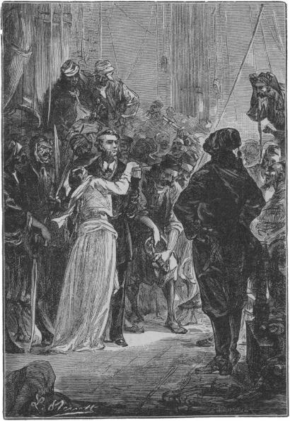 A Syphanta parancsnokát iszonyú szitkozódások közt előre hurczolták. Egy kötelet már megerősítettek a vitorlafa végén, még nehány pillanat és egy franczia tiszt gyalázatos módon kivégeztetett volna. Ekkor Elizundo Hadsine megjelent a fedélzeten.
