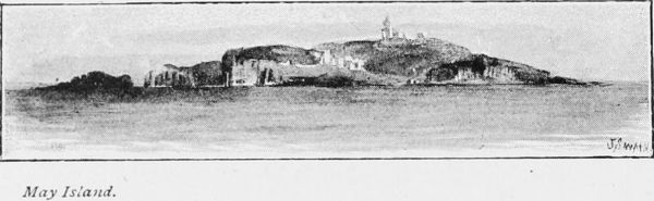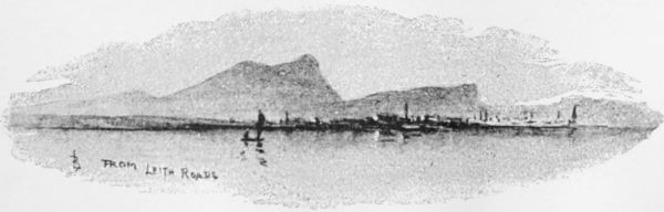 As we passed close to the rock the steam-whistle was sounded, and at once great numbers of solan geese rushed forth like a living whirlwind, darting and wheeling in the air, and filling it with their hoarse cries. The noise had scarce died away when we passed North Berwick—sentinelled by its Law, and guarded by its outposts, Craigleith and Fidra. The haze grew denser and denser as we sailed up the Firth of Forth, so much so that it was thought advisable to go at half-speed. Inchkeith was not visible until we were within less than a mile of it. One consequence of the changed atmospheric conditions was that a projected visit to the Forth Bridge had to be postponed;[91] another was, that we failed to obtain the view of Edinburgh from the sea, which is considered one of the finest.