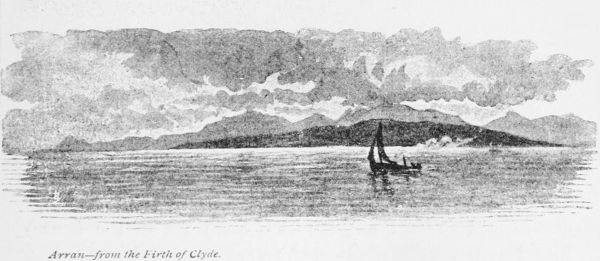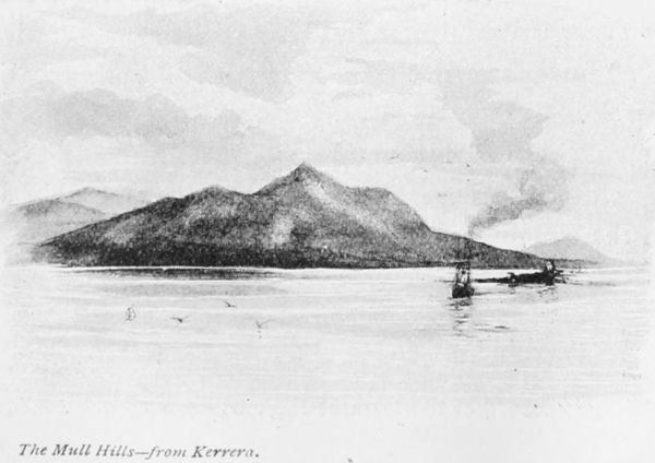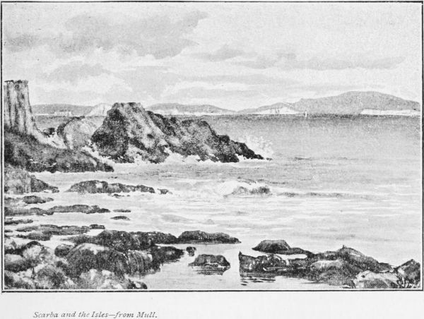 The village, which, like a few other places in the Highlands, looks best at a distance, skirts two sides of the Bay. The western banks are steep and richly wooded. On the east, the Bay is cut off from the sea by the small island of Calve, which forms a natural breakwater, thus producing a spacious and very safe anchorage. Aros House, imbedded in woods, stands on the south side of the Bay, and near it there is a very fine waterfall on the stream which emerges from the Mishnish Lochs—a favourite resort of anglers. From the deck, a lovely view of the Sound of Mull is seen over the crest of Calve. The hills in the distance are dark, but the east shores of the Sound are lighted up with gleams of sunshine, developing marvellous combinations of colour.