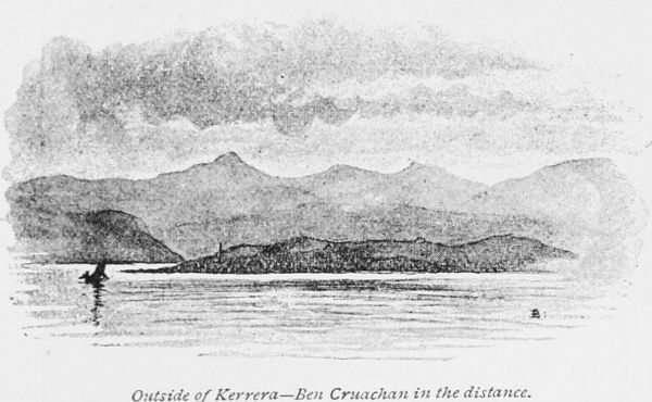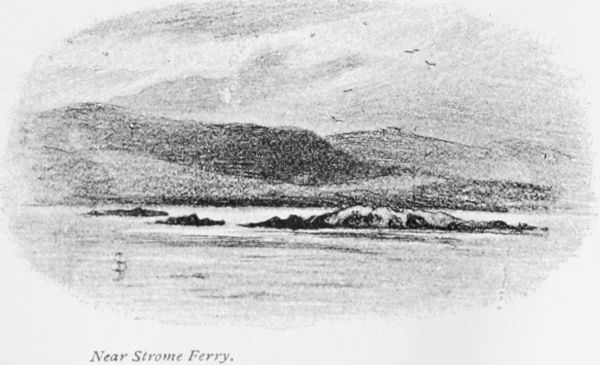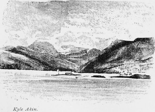 Later in the day, and still on board the ‘Iolanthe,’ we steamed through the narrow passage of Kyle Akin (between Skye and the mainland) into Loch Alsh. The mouth of the loch is intersected by reefs and rocks, on the crest of one of which is the ruin of Castle Maoil. Near it, on the right hand, is the pretty village of Kyle Akin, built round a crescent-shaped bay with lovely sands. One would like to pause at such a charming spot, or to visit Balmacarra, peaceful and sweet-looking, or to inspect more closely the monument, not far off, erected by Sir Roderick Murchison to the memory of one of his ancestors who heroically collected the rents of the proscribed Earl of Seaforth after the ’45; but we have to content ourselves with distant views, in the meantime at least.