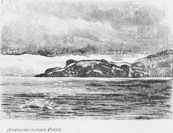 The day being still young, the ‘Iolanthe’ is brought into requisition, and a delightful trip is made up Loch Sunart, a veritable fiord in its windings, and its narrowness, and its flanking mountains. As we enter the Loch, we catch one of those occasional and transient effects which delight artists, but which it is hazardous to paint, and still more difficult to reproduce without colour. A brilliant rainbow rests one of its extremities on the massive hill of Ardnamurchan, and practically cuts it in two; one half of it being melted away under the changing colours of the arch.