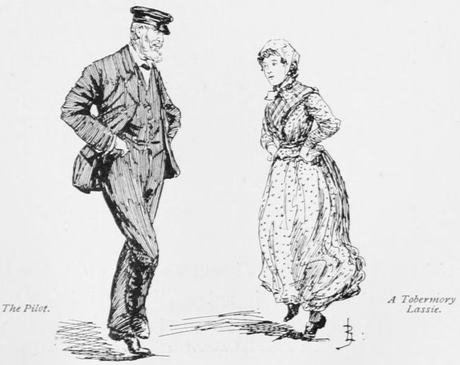 The evening was given up to recreation, including dancing to the music of the ship’s band, under the awning on the promenade deck, which, lighted up with electric lamps, made a spacious and brilliant ballroom. This was carried on in presence of nearly the whole population of Tobermory, which had come out, on Sir Donald’s invitation, to see the stately ship. The performances were not by any means confined to the saloon folks. Our stalwart pilot, relieved of his duties for the night, came out strong in the ‘reels’; and, having shown his paces in a ‘fling’ with our chief, he was in[45] great request with the Tobermory lassies, with one of whom he engaged in a kind of terpsichorean duel, which reminded the spectators of