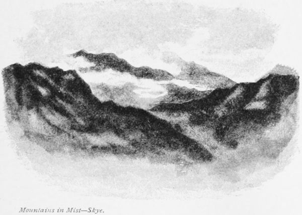 To tell the truth, however, the scenery had to be taken very much for granted. One or two picturesque bits of[51] rocky coast were all that could be seen. ‘M‘Leod’s Maidens’ were ‘children of the Mist.’ Dunvegan Castle was nowhere. Duntulm was invisible. The bold Quiraing, and the Old Man of Storr, and Prince Charlie’s Cave, were held as seen; and when we anchored in the evening in the Sound of Raasay, opposite Portree, we might have been anywhere.