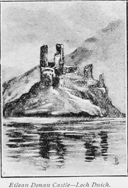 At the head of the loch, we approach the ruin of Eilean Donan Castle, which stands at the junction of three lochs—Loch[59] Alsh, Loch Long, and Loch Duich. The castle, built on a detached island, must in olden times have been a place of strength; but the story goes that it was demolished by the guns of Cromwell. Passing the Castle on the left, we enter Loch Duich, which, though an arm of the sea, has all the appearance of a fresh-water lake, so smooth is its surface, and so soft and fertile are its banks. It attains its greatest beauty near the mansion-house of Inverinate and the village of Kintail, in the midst of rich woods on its northern shore. The prevailing green tints gleam out in the fitful sunshine with a richness and variety that are enchanting. At its head, the loch is closed in by a magnificent group of pyramidal mountains—Ben Attow, Scour Ouran, Ben Mhor, and the Saddle—all rising to a height of upwards of 3300 feet, and separated by well-defined and gloomy valleys.