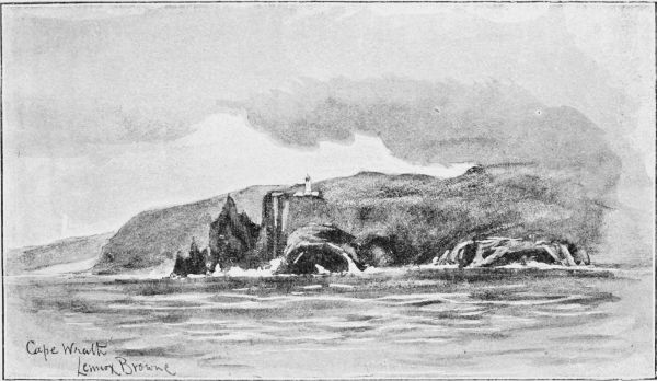 [66]Cape Wrath, now seen by many of us for the first time, is really a splendid headland. The name in its modern interpretation may be appropriate enough, considering the wild seas that roar and bluster around it; but in point of fact it has no connection with the English word ‘wrath.’ It is a corruption of the Norse ‘Hvarf,’ which meant ‘the turning-point of the land,’ and might have been more correctly[67] Englished ‘Cape Warp.’ The lighthouse stands on a cliff 370 feet above the sea, beneath which there is a succession of jagged points, or needle-rocks, stretching seaward, perforated at their bases with several openings, through which the surf breaks and spends itself in spray. A more perilous point for shipping in a dark night it would be hard to conceive. As we passed the Cape, the cold, rainy squalls which had followed us for some time cleared off, leaving behind them, however, very striking effects of sea and sky.