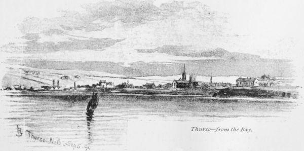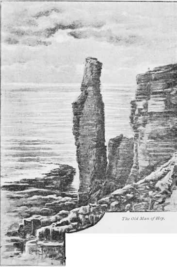 [69]At Thurso (which is Thor’s Town, another Norse landmark) we were in touch once more with the British railway and postal systems. The most prominent object on the mainland was the castle lately rebuilt by Sir J. G. Tollemache Sinclair—a cold-looking mansion, rendered more forbidding by the absence of trees. The town itself looked very picturesque, with its spires and chimneys breaking the coast-line, while the fields of golden grain that surrounded it bespoke fertility and prosperity. Other noteworthy features of the neighbourhood were Harold’s Tower, the Bishop’s Castle, and the bold bluffs of Dunnet Head, the most northerly point of the mainland. The northward view included the Orkney Islands, and Hoy Head, with the Old Man of Hoy at its base, which, at a later hour, and in the ‘witching time of night,’ stood out grandly in the moonlight.