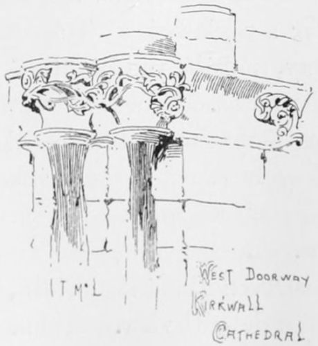 The Cathedral forms, of course, its chief attraction. This building, which is the most conspicuous object in the town, as seen either from the sea or from the land, dates from the twelfth century, having been founded by Jarl Rognvald in 1137, in memory of his uncle, St. Magnus. Its style is chiefly Norman, but it contains many features of the Pointed Gothic or Early English style, which makes it extremely interesting to the antiquary and the architect, resembling in that respect the famous Cathedral of[72] Trondhjem, which belongs to the same period. Outwardly, it is wonderfully well preserved. Though really a very small building of its kind—a cathedral in miniature,—its parts are so well proportioned that it has almost an imposing appearance. Worthy of special notice are the great east window, which Sir Henry Dryden believed to be unique; the circular window in the south transept; and the carving of the west door, which Dryden refers to as probably the finest example in the British Islands of the effective combination of particoloured stones. But the delicate floral work in the arch of the doorway is now much weather-worn, and the fine pillars are wasted to skeletons. The tower, to which we mounted, commands a splendid view of the town and bay and the surrounding islands.