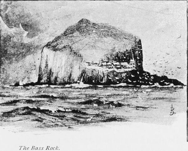 The Bass Rock (313 feet high) is the counterpart in the Firth of Forth of Ailsa Craig in the Firth of Clyde; and it is remarkable that these two rocks are the only ones in Scotland that are frequented by the gannet, or solan goose. The Bass presents a very bold outline, from whatever point it may be seen. Its summit slopes from north to south, and[90] it is surrounded on all sides by steep cliffs, rising sheer out of the sea. The only possible landing-place is on a shelf of rock on the south side, above which are the ruins of a fortress, which stretched across the island from east to west.