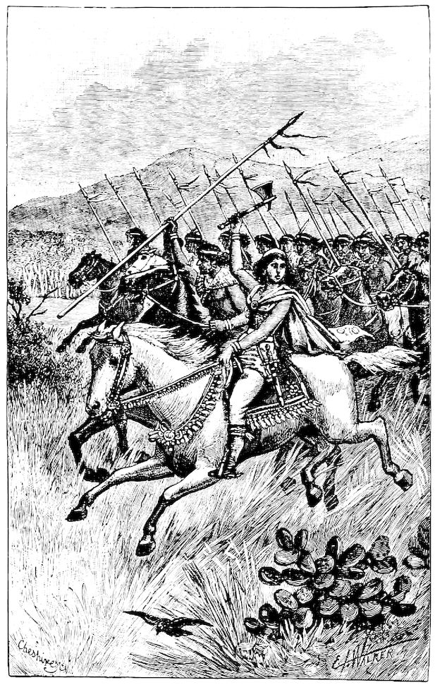 “Warriors!” he cried, “has not Gilwinikush fought the hated enemy on our ground, on our behalf, and shall we scout advice from our best friends? Not so. Piñone bids ye charge and surround the Cristianos, and he will give a horse in exchange for every prisoner.”