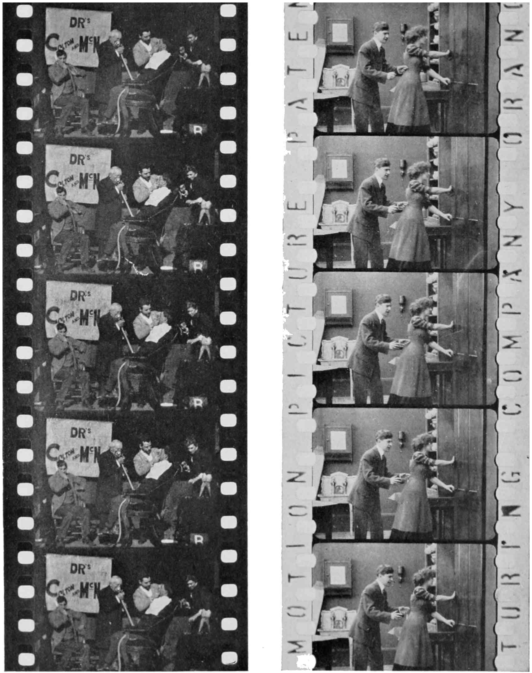 The question often arises: What becomes of the films? Bearing in mind the thousands of feet of new subjects which are introduced to the market every week, it is but natural to think that there must be an immense accumulation of old subjects. When a new subject sees the light it passes through its first “run” among the foremost picture palaces of the country. Then it is returned to the renter, who dispatches it upon a second journey among the smaller halls. Once more it comes home, otherwise to the shelves of the renter, as a rule bearing sad evidences of its service. If of sufficient interest, the film331 undergoes a third run among the cheapest halls, and upon the completion of this round it is either shipped abroad to the smaller colonies, or, scratched and torn, it is offered for sale at a bargain price. The end is tragic: the film slips from sight in flame and smoke.