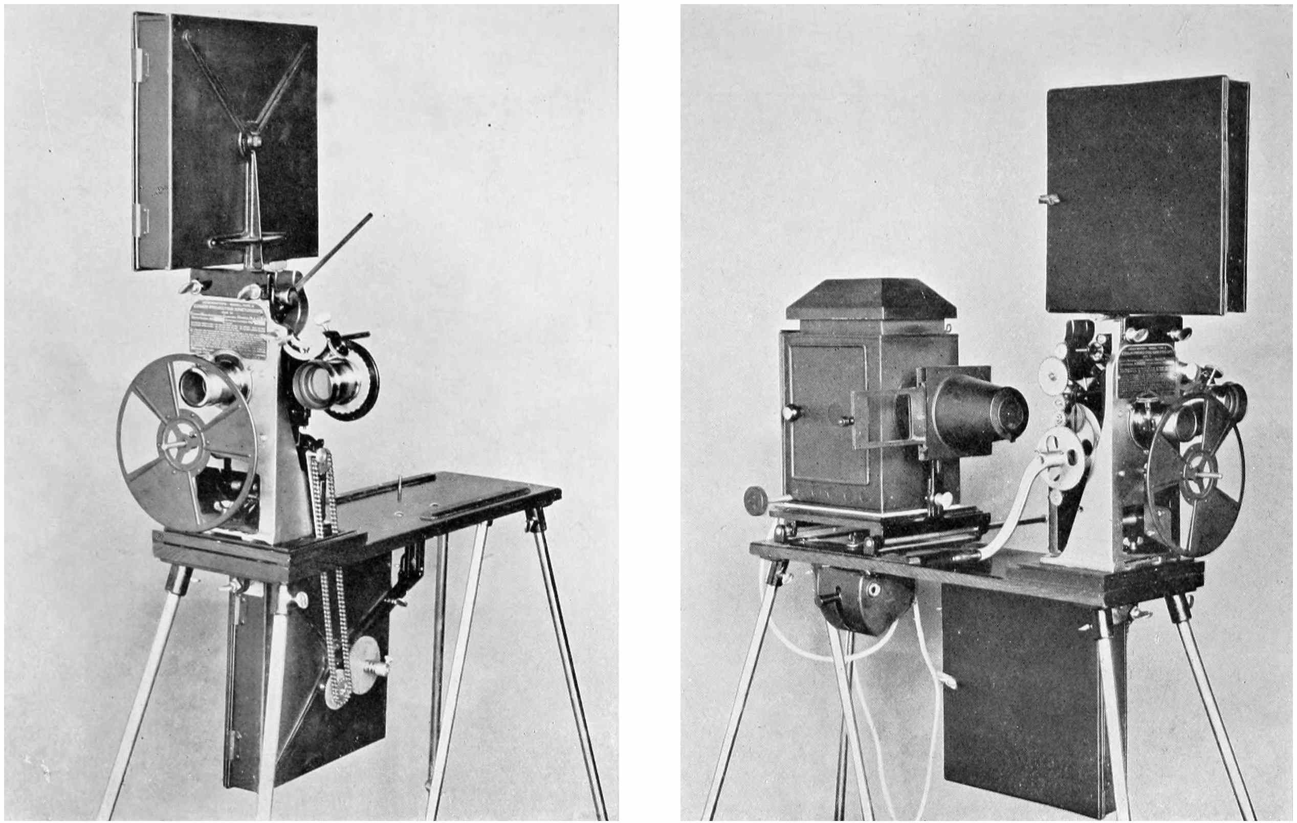 The projector works upon a similar principle. There are the two objectives with attendant mechanisms driven by a single handle, mounted side by side, and with a common shutter mounted centrally between. Projection is identical with recording. The picture is thrown from the right-hand objective, while the left lens is covered, and vice versâ.