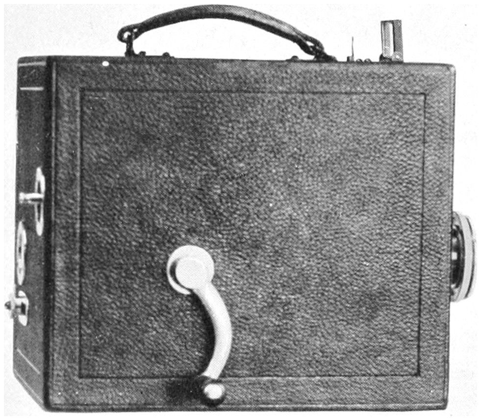 The whole principle of the Bettini cinema-à-plaque, as it is called, is entirely new. The camera itself, a small contrivance, wrought in aluminium, measuring some 8 inches in length by 4 inches wide and 3½ inches high, is no larger or heavier than a Kodak snap-shot camera. This box contains the actuating mechanism, which comprises a longitudinal shaft, carrying a peculiar thread, on which is mounted, and along which moves, the objective, motion being imparted thereto by the revolution of the handle in the ordinary way. The sensitised plate, instead308 of being slipped in position at the rear of the box and facing the lens, is inserted at one side and at right-angles to the front aperture. The objective is a combined lens and a prism mounted upon the travelling part. The light, passing through the front aperture, enters the prism and thus is bent at right-angles through the objective on to the plate.