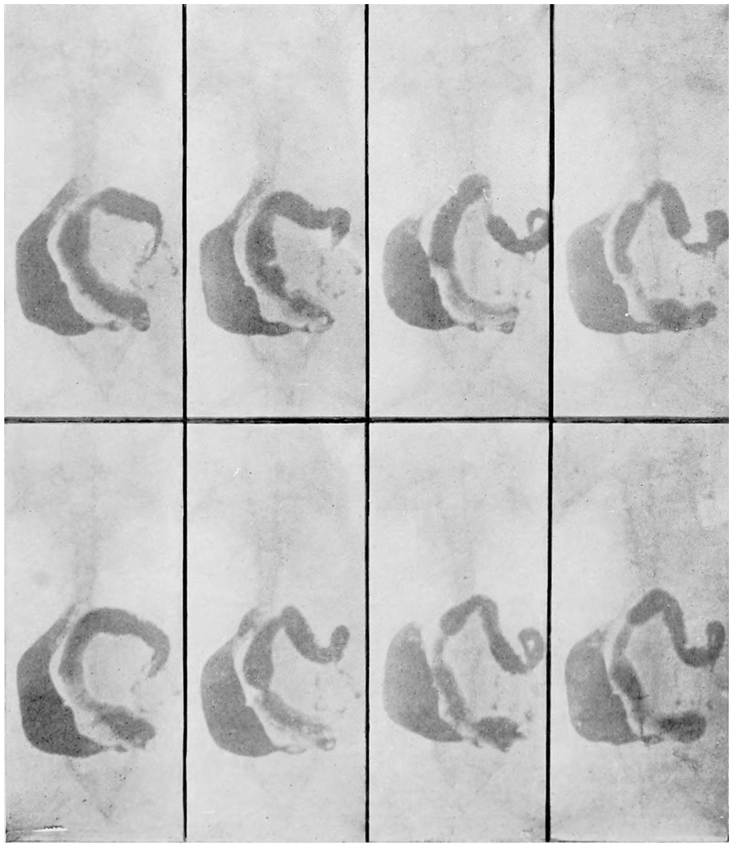 By means of his apparatus he obtained some very interesting and instructive pictures, such as showing the process of digestion in the frog, mouse, chicken, etc. The subjects were fed with a peculiar paste, or the usual food combined with basic bismuth nitrate. As a result of these successful experiments a further application of moving pictures has been revealed. In combination with the X-rays the apparatus should prove highly useful for ascertaining what actually takes place under certain conditions in the various organs of the human body.