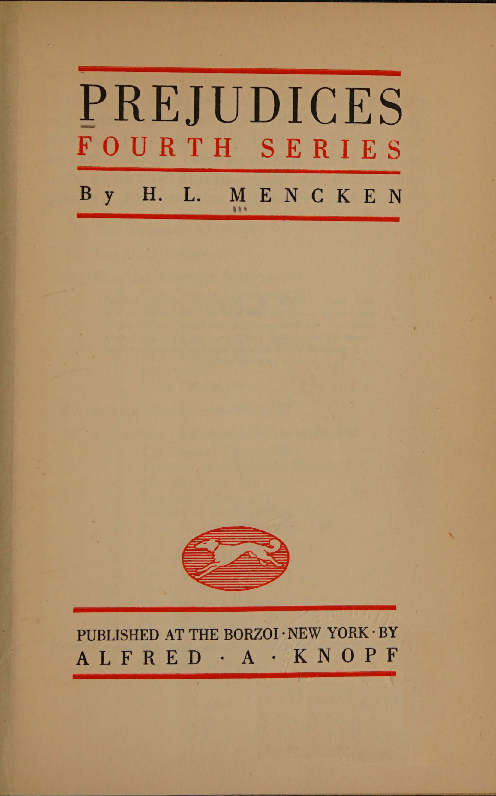 THE FIRST EDITION OF “PREJUDICES: FOURTH SERIES” CONSISTS OF THIRTY-SIX HUNDRED AND TEN COPIES AS FOLLOWS: ONE HUNDRED AND TEN ON BORZOI ALL RAG PAPER SIGNED BY THE AUTHOR NUMBERED FROM 1 TO 100, AND A TO J; AND THIRTY-FIVE HUNDRED COPIES ON ENGLISH FEATHER-WEIGHT PAPER.