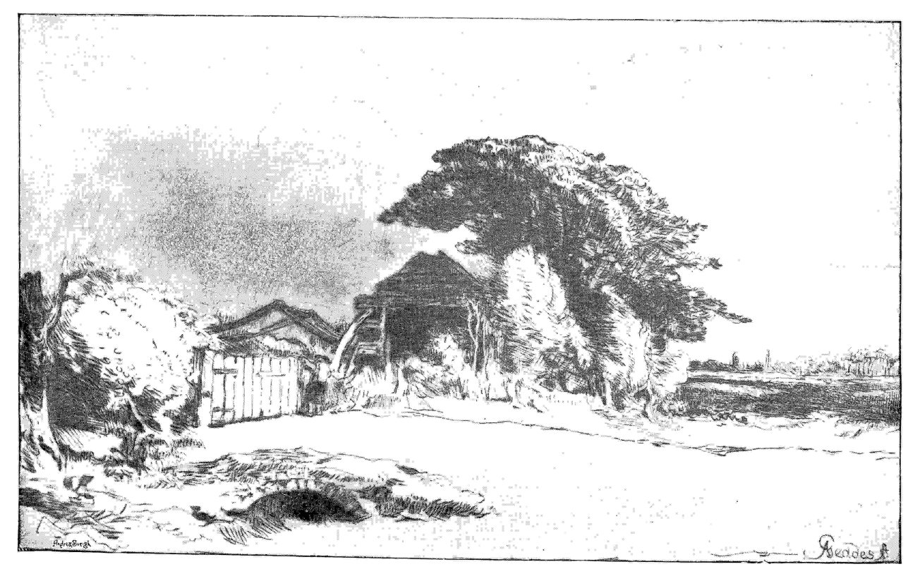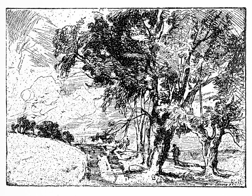 AS in France and America, so, very specially, in England, the productions of the etcher have to be divided broadly into two classes, one of which is the result mainly of a commercial demand, and the other, of an artistic impulse. The etcher whose employment of the etching-needle is confined wholly, or confined in the main, to the work of realizing and translating the conceptions of another, is, like the reproductive line-engraver, or the reproductive engraver in mezzotint, little more than the dexterous instrument which carries anothe message. So artistic is his process, when it is properly used, that it is preferable indeed that he be himself an artist as well as a craftsman—it is indeed essential that he shall have some measure of artistic feeling, as well as the flexibility of the executant.{2} But our demands upon him stop, in any case, at a comparatively early point; and we find him more or less sharply cut off in our minds, and in our estimation, from the artist who, when he employs the etching-needle, is occupied with the spontaneous expression of his own thought and fancy—of the particular things of beauty and of interest which may strike him on his way through the world.{3}