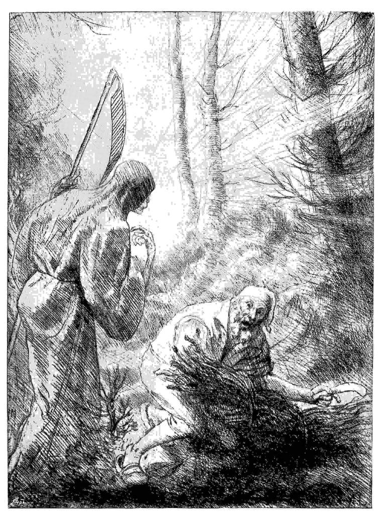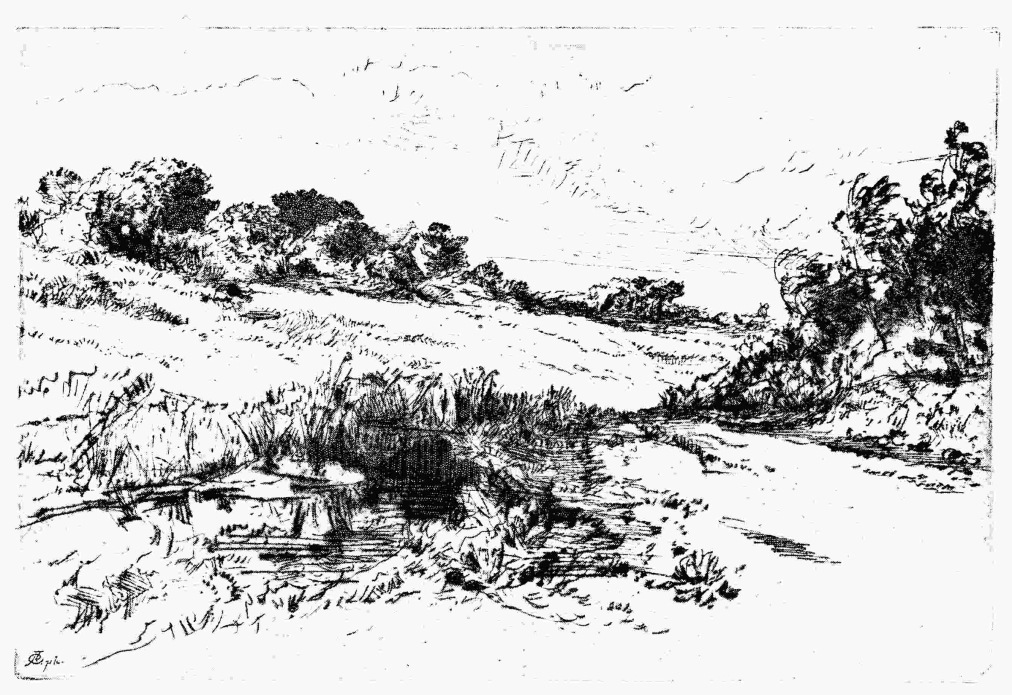 Realist, but always poet, in his treatment of these themes—and in the treatment of such a dramatic plate as “ncendie,” such a nobly imaginative plate as “La Mort et le Bûcheron”—Legros, when he betakes himself to landscape, is realist no longer, or, rather, his realism here is shown only in his contentment with the homely scene, the most everyday material. Generally, on impression of his landscape is that it is built to some extent upon the memories of his youth; that, since then, a little observation has gone a long way—that he has cared to dream and fancy rather than to actually notice. Here and there, in his etchings, one maybe reminded of the uplands around Dijon, or of the chalk hills of the Boulognais, with its wide fields and haystacks, its gaunt outhouses—a land which rumours of “high farming” have never reached. As the railway train swept under the hillside, Legros, one thinks, may have profited by a glance from the windows. And out of the glance, and out of the memory, and out of the{70} artis genuine sympathy with humble and monotonous days, there has grown a homely poem.