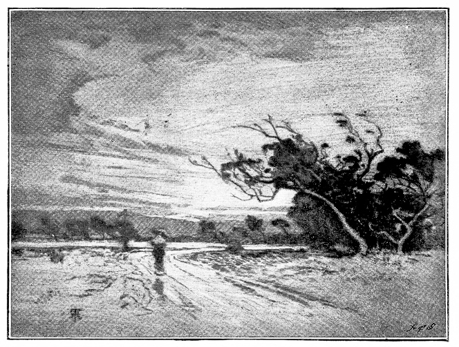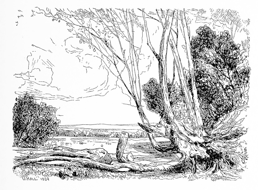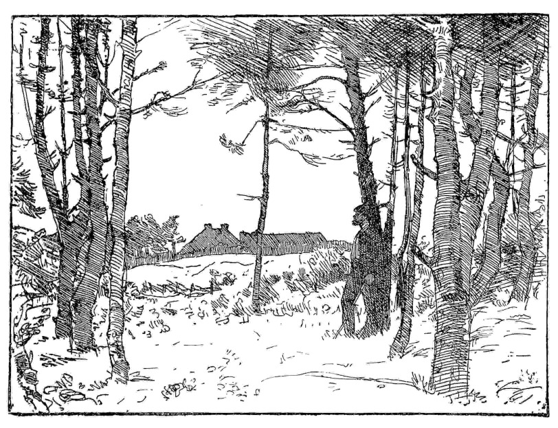 Mr. Hall has not yet wrought very many{116} plates; they number, it may be, two score. He is not, in his work, always faultless, and perhaps he is not thus far very varied. But he is in the right track, and has shown no disposition to leave it. He has done beautiful things—the “Coniston Hall” one of the finest of them. He is a vigorous, frank, free sketcher, often sketching “effects,” as well as forms that vanish less quickly; and, in the realm of effects, the very spirited etching, “A Windy Day,” is perhaps the best of that which he has done. It is a scene on Angerton Moss, a stretch of open country rising to the right; the scattered trees and clustered farm buildings on the horizon line; and they are wind-swept, and wind is in the sky.{117}