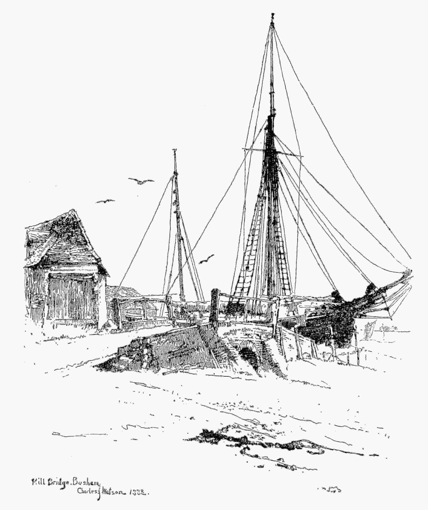 work not proceeding to a conscious elaboration, yet not stopping short of the point at which even for the many it may be expressive. Its quality, however, good as it is, does not really give it a unique place in the list of Gof labours; other plates—some that would be considered very humble ones—show virtues quite as valuable. Few etchers are Gof equals, fewer still go beyond him, in composition of line, in arrangement of light and shade; and as he firmly possesses this science, it is natural that very many of his plates, and not only one or two of them, should satisfactorily display it. “Norfolk Bridge, Shoreham”—of which a reproduction is given here—displays it delightfully. The unity of impression is complete; the grouping well-nigh faultless—there is the light arch of the bridge and the dark mass of clustered town behind it; church and houses and timbered sheds set amidst the winding of tidal waters; muddy shores, from above whose low sky-line there rises now and again the mast of a fishing-smack.