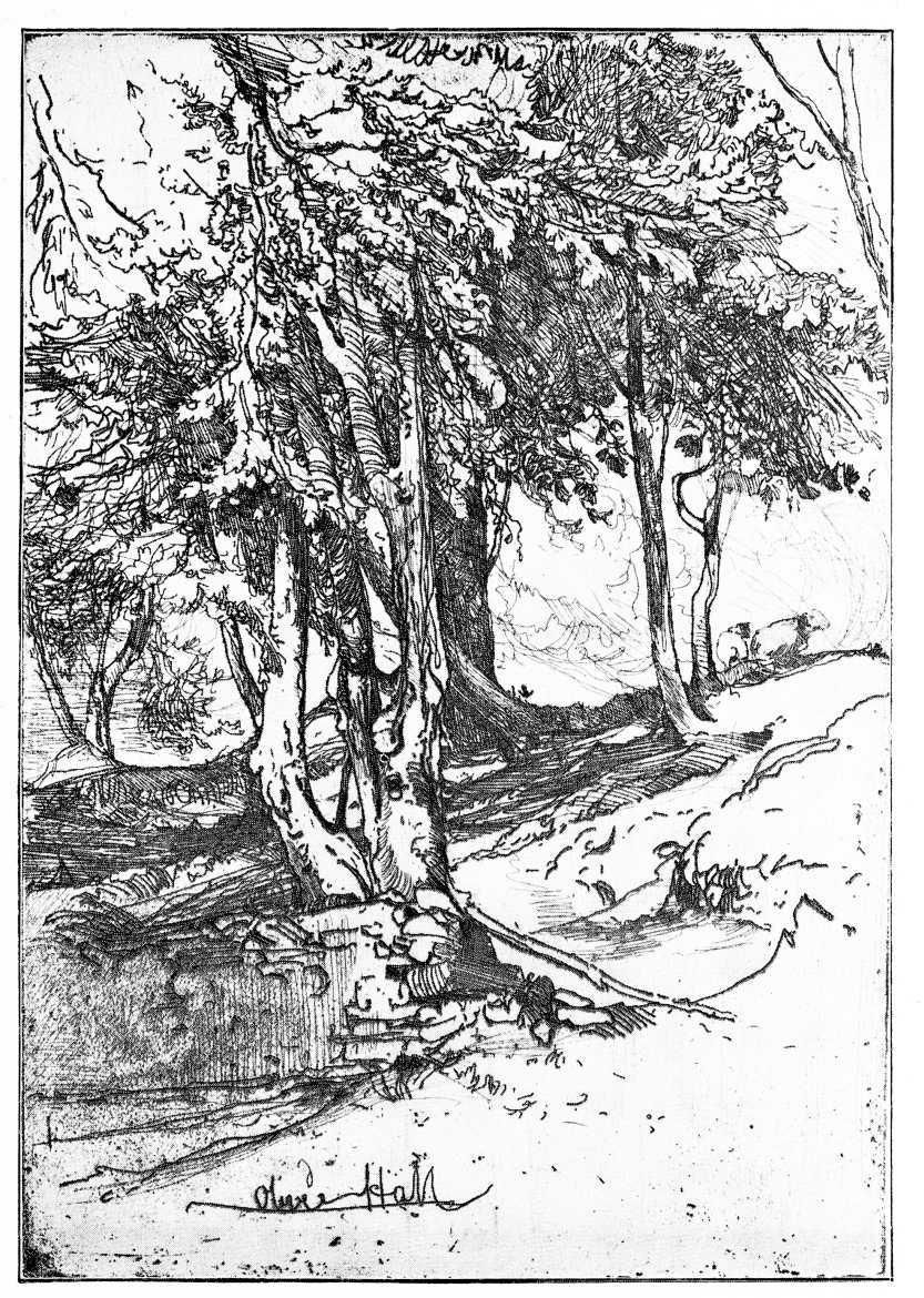 MR. OLIVER HALL, a young and, until lately, a comparatively little-known but a distinctly interesting and strongly gifted etcher (who paints, he tells me, a good deal in water-colour), has next to be spoken of; and if his work has one characteristic more than another—though grace and freedom are its characteristics too—the one that is most its own is the continual evidence his plates afford of his enjoyment of growth and building up—his pleasure in the traces of the way by which the object before him became the object that it is. Mr. Hal object is more likely to be a tree than a church. Architecture he does not attack, and his rare figures are but the figures of the landscape-painter. He labours amongst sylvan and amongst pastoral scenes that are not strikingly picturesque; and in method, as well as often in theme, he suggests Seymour Haden.