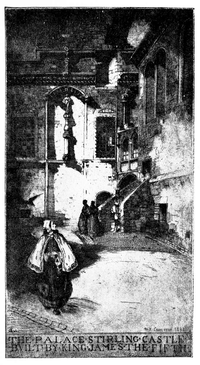 “The Arch,” a composition of curious shape—a tall, narrow plate—is a performance of solidity and brightness, although it shows that Mr. Cameron is apt to finish to the corners with a thoroughness too uniform or obvious—to be, indeed, like Mr. C. J. Watson, a little too positive and too material. In the “Flower Market,” with its fleeting lights and shades, he leaves in part this positiveness. He makes an interesting experiment, but, after all, recalls the theme to which he addresses himself, only enough to assure you that the experiment has not been made in the medium that is fittest for it. “Colour, colour, colour!” you say. “The Palace, Stirling”—a dark forbidding interior—has certainly about it a grim Celtic imagination, and is individual in that. The oppositions of light and shade are at once strongly marked and skilful—their distribution quite successfully studied—in “White Horse Close.” “The Dolphins” (1892) is full of vigour and vitality. Even better, perhaps, is “St. John Street, Stirling;” because its draughtsmanship is at once freer and more hesitating—not fixed and petrified, that is, but trembling with the semblance of life. And in the background of “A Rembrandt Farm,” Mr. Cameron has wonderful reminiscences,{139} both of the maste touch and of his way of looking at the wide-stretched landscape that he cared for the most. Nor does the plate suffer perhaps from being for once a deliberate imitation, successfully accomplished. Yet I admire Mr. Cameron more—my hope for his Future is more certain—when I hold in my hand a good impression of his “Border Towers”—a composition of his own North country—a thing in which the inspiration has been very personal, and the fine work of detail has been obtained at no sacrifice of noble breadth.{140}