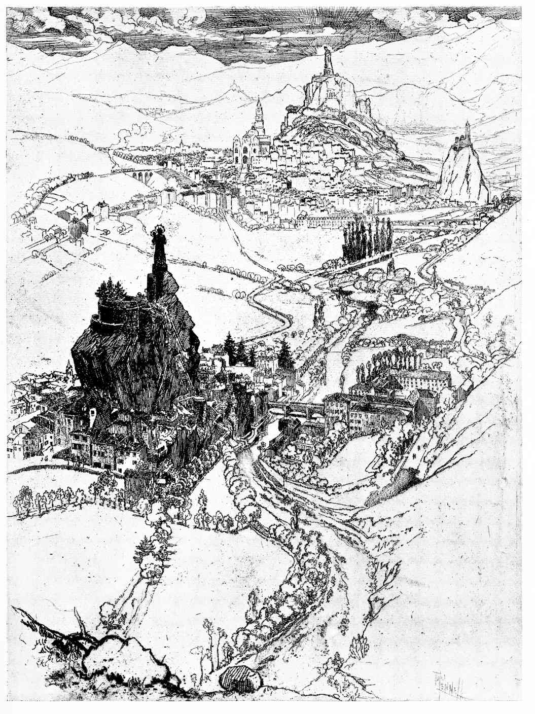 well of the grammar of his art, and of some of the best of its methods, he yet, as his own work reveals him, is, at times, uninteresting, since he is always unimaginative. Vista he has none. Yet, how good can his work be when the subject comes easily to help him! Nor is that seldom. The plate of “Le Puy en Velay,” of which I give a reproduction, and which I like so much, recalls a noble Dürer background—takes our thoughts to those great elder masters who, from certain remarks that he has made about them, I judge that Mr. Pennell scarcely likes at all. It is the irony of circumstance.{144}