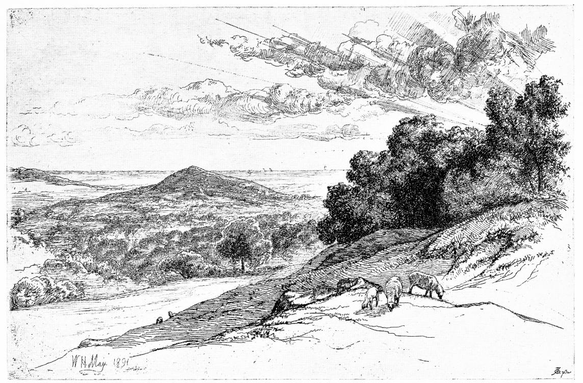 Again, there is Dr. Arthur Evershed, a ready and sensitive draughtsman with the needle, whose “Marsh Farm” is only one out of a score of evidences of his refined enjoyment of the quiet lines of uneventful lowland landscape. Sir Charles Robinson and Dr. Propert need by no means be forgotten. Mr. J. P. Heseltine has not perhaps exhibited much of late; but he, as long ago as when he wrought that series of Etchings Mrs. Noseda published—it was some twenty years since—gave ample proof{166} of his placid, sympathetic observation of the ordinary land, and of his ability to record the charm he was not tardy in feeling. The etched work of Mr. Holmes May is, most of it, I think, more recent. It is a vigorous, independent sketching of landscape. It notes tree-form with energy and sky effects with refinement.