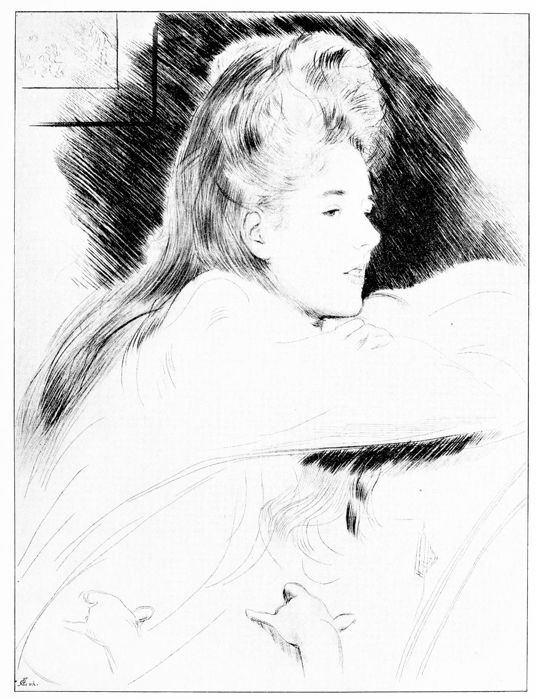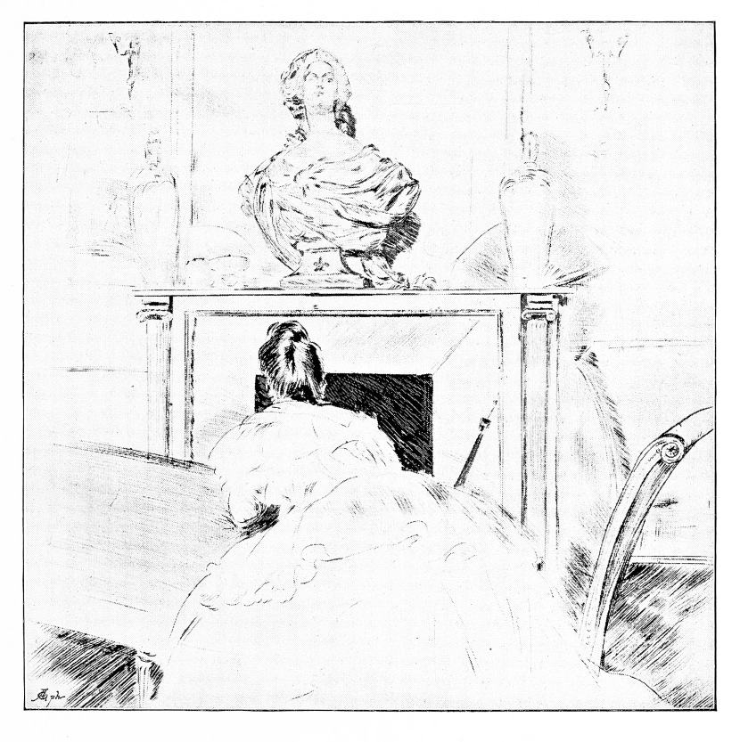 inspired by the material that he was readiest to receive. And so in the work of that brilliant artist in dry-point to whom I turn last of all, there is evident the sign of his own leanings, the engaging suggestion of those things in his daily life which he most sympathetically notes. And M. Helleu is, above all things, the recorder of the beautiful or the refined interior, with its charm of artistic and harmonious detail—its charm, above all, of feminine life, or of the life of children.