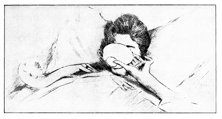 “Femme à la Tasse,” a study of two uplifted hands, holding between them, lightly, in the fingers, a porcelain cup out of which the reclining figure drinks, is a most delicate arrangement of “line,” and of amazing economy of means. And the “Salon Blanc,” or one especially of the several{184} plates which bear that name, is to be noted not for the figure only, not, perhaps, for the figure even chiefly, but for the brief and dainty suggestions of tasteful furniture, the line of a screen, the mouldings of a mantelpiece, the curve of a girandole.