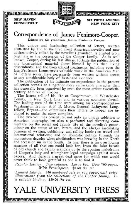 This unique and fascinating collection of letters, written 1800-1851 by and to the first great American novelist and now authoritatively edited by the novelist’s grandson, is printed from originals in the possession of the Cooper family. As is well known, Cooper, during his last illness, forbade the publication of any biographical material about himself by his then living descendants; and the biographical treatments, including even the late Professor Lounsbury’s valuable work in the American Men of Letters series, have necessarily been written without access to any considerable body of first-hand evidence.