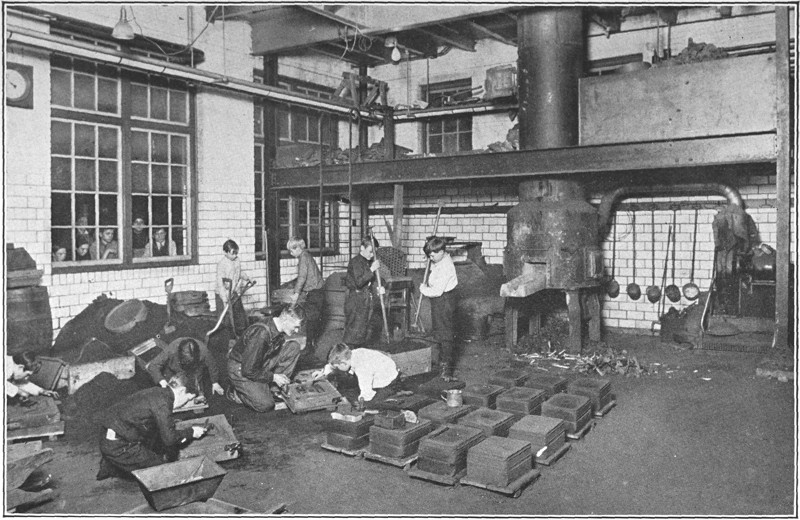 The manual and industrial work is, of course, an essential feature of the Wirt school. The shops are much more extensive than is customary in even the most progressive public school, or even in the special trade school. The Emerson School in Gary has, for instance, a carpentry-shop, cabinet-shop, paint-shop, foundry, forge, machine-shop, printery, sheet-metal shop, electrical shop, sewing-room, and cooking- and dining-rooms, all admirably equipped as regular shops, and not merely as manual-training rooms. The Froebel School has, besides these shops, a plumbing-shop, a laundry, a shoemaking-shop and a pottery-shop. In the smaller schools several shops are combined into one, as at the Jefferson, though the work done is just as genuine as at the ideal plant. The number of shops, or the variety of work, is, as we shall see in the next chapter, limited only by the services which the school demands in the way of repairing or enhancing its physical facilities.