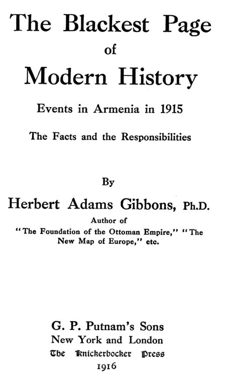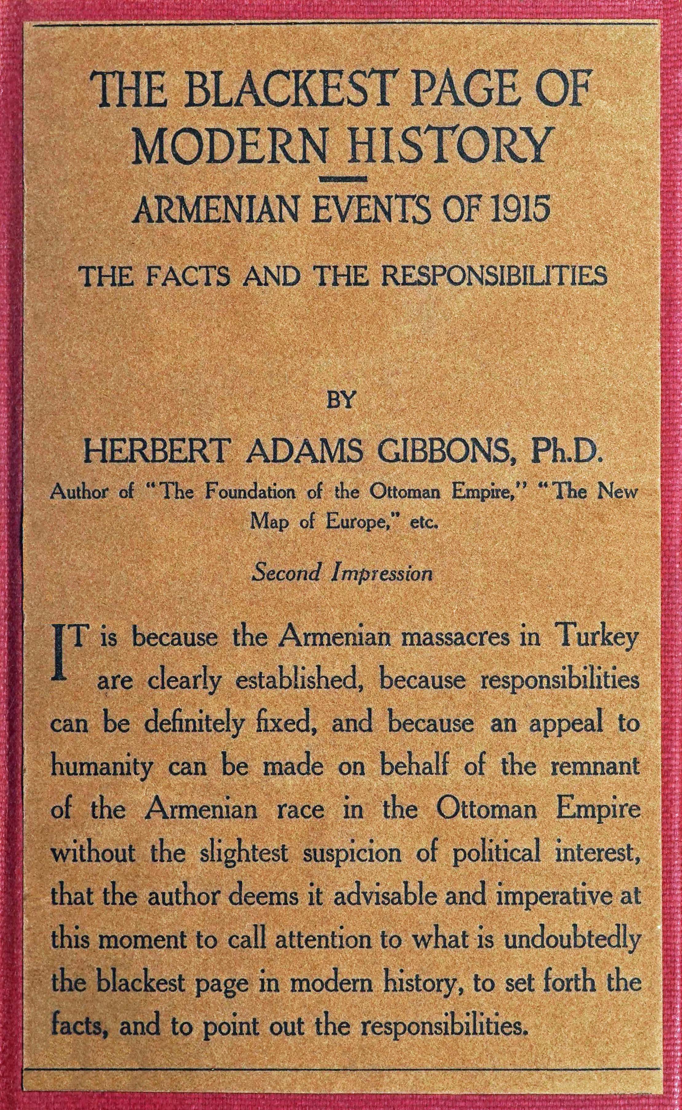 It is because the Armenian massacres in Turkey are clearly established, because responsibilities can be definitely fixed, and because an appeal to humanity can be made on behalf of the remnant of the Armenian race in the Ottoman Empire without the slightest suspicion of political interest, that I feel it advisable and imperative at this moment to call attention to what is undoubtedly the blackest page in modern history, to[8] set forth the facts, and to point out the responsibilities.