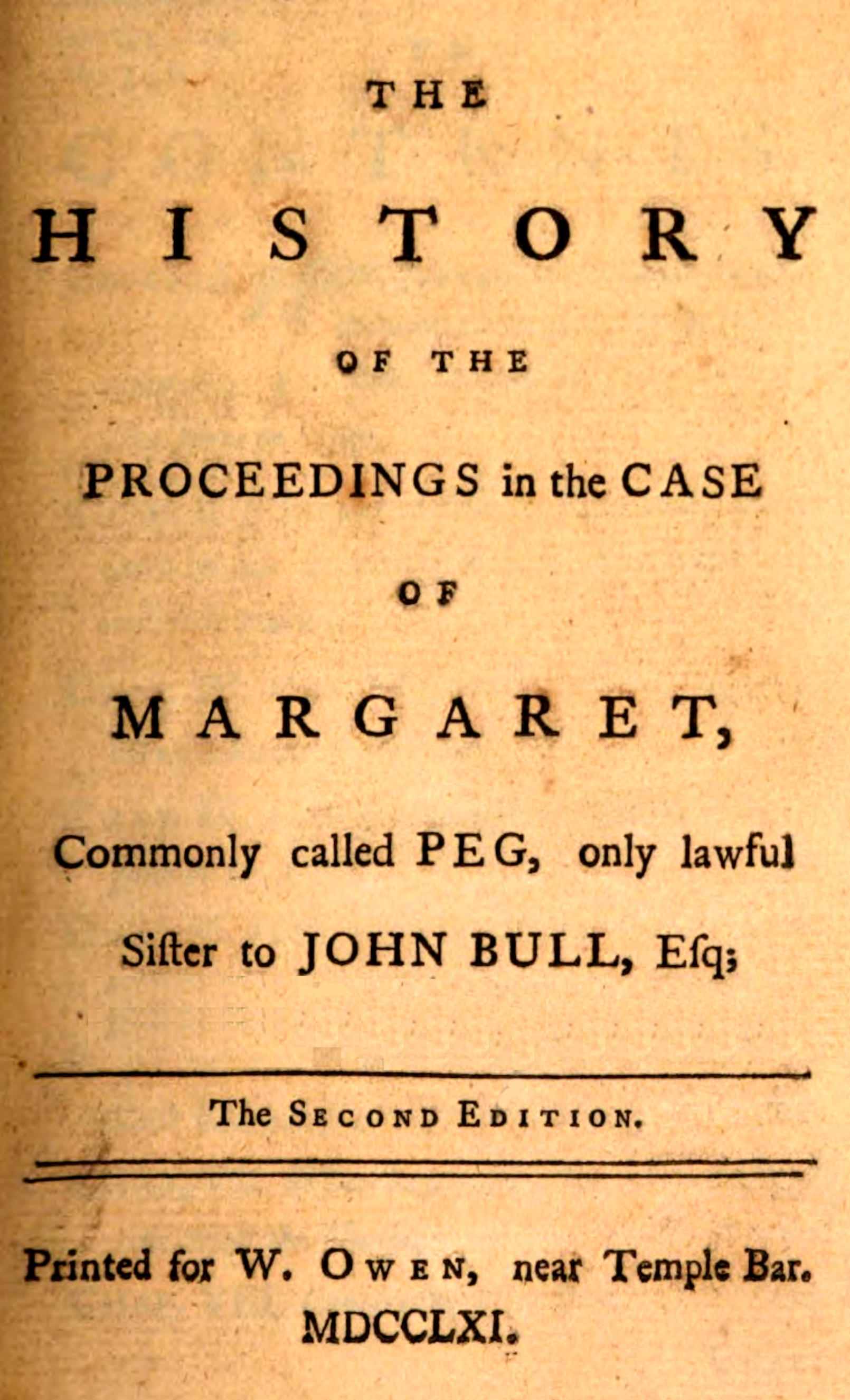 Title: The history of the proceedings in the case of Margaret, commonly called Peg, only lawful sister to John Bull, Esq.