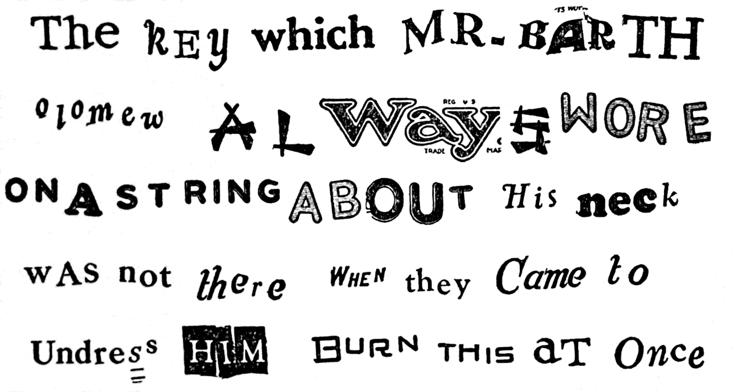 “A man thinks he’s honest till he comes to the point of trial. When they asked me if I wrote anything to anybody about that key, I said No, for I didn’t write anything as you must know who read the printed letters I pasted in such crooked lines on a slip of paper.”
